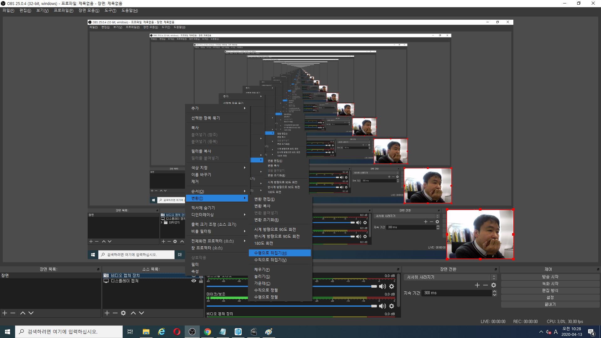 한편 웹캠 등은 일반적으로 좌우가 반전되어 나옵니다(스마트폰 셀카모드 처럼). 소스 목록에서 마우스 오른쪽 버튼을 클릭하시면, 여러 메뉴가 나오는데 이 중 변환>수평으로 뒤집기 하시면 좌우를 반전시킬 수 있습니다.