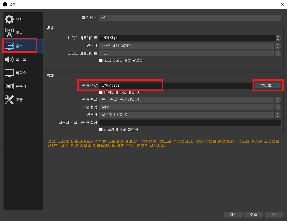 우선 출력에서 녹화된 파일이 저장될 경로를 지정하실 수 있습니다.