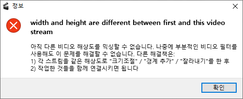 메뉴에서 "파일(F) > 정보"를 클릭하면 해당 영상의 속성이 나오는데, 각 영상의 해상도를 맞추어 줄 필요가 있다.