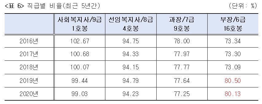한편 과장 이상에서는 그 경향성을 파악하는 것이 어려웠다. 다만 지난 5년간을 기준으로 다시 살펴보면 사회복지사는 99%, 선임사회복지사는 94%, 과장은 77%라는 일관된 값을 얻게 된다. 단지 부장급에서만 과거 73% 수준에서 80%로 조정되는 것을 확인할 수 있다.