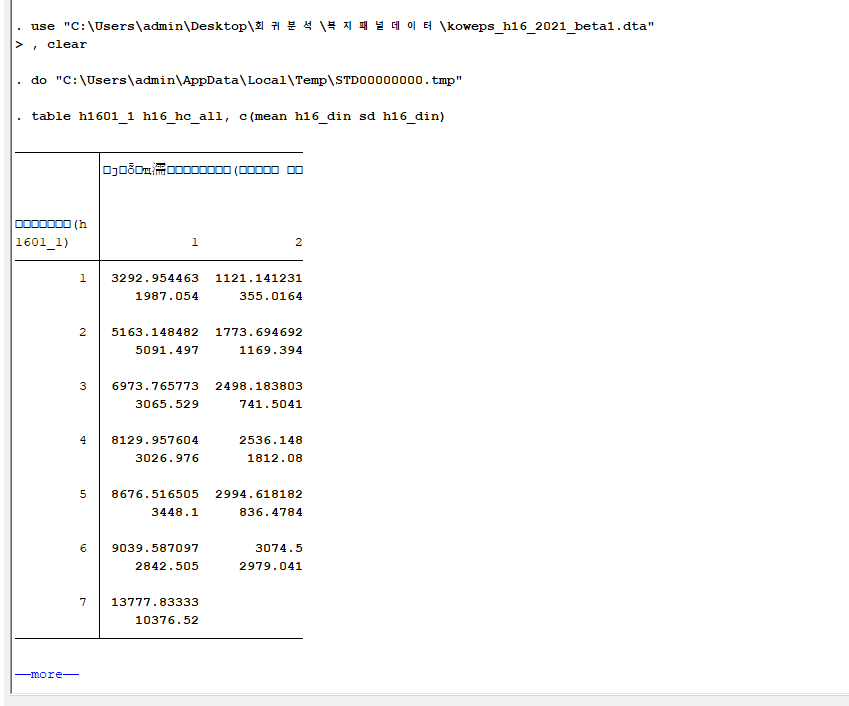 예) .table h1601_1 h16_hc_all, statistic(mean h16_din h16_cin) statistic(sd h16_din h16_cin)