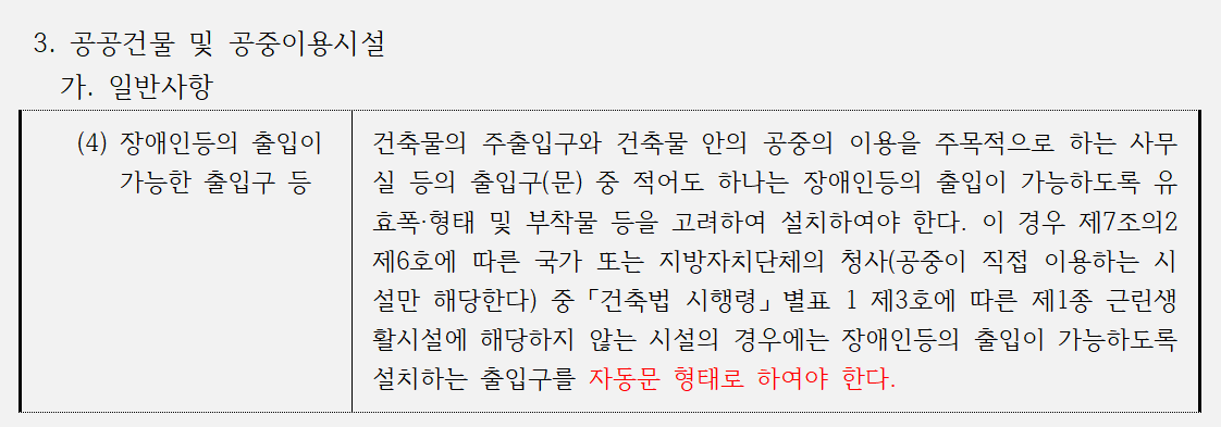 위에서 확인할 수 있듯이 언뜻 보면 공공건물에 해당하는 사회복지시설(노유자시설)도 출입구를 자동문으로 해야 하는 것처럼 보인다. 위 내용을 좀더 세부적으로 쪼개어보자.