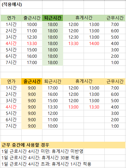3. 4시간 초과 근로시 점심시간이 포함되는 바 1시간 휴게시간 적용