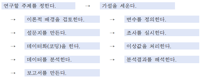 우리는 실천 현장에서, 학계에서 논문을 쓰기 위해 등의 이유로 통계를 사용하게 된다. 이런 상황을 가정하여 그것이 어떻게 진행이 될지를 한번 상상해 보자. 아마도 다음과 같은 순서를 떠올릴 수 있을 것이다.