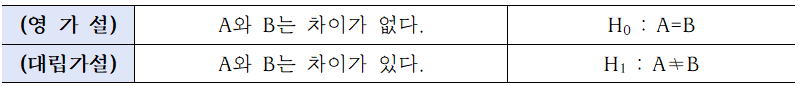 하여 철저하게 데이터분석의 측면에서만 개념을 단순화하여 설명해보고자 한다. 영가설에서의 零은 숫자 0을 말한다. 그리고 영가설의 영어 표현인 null hypothesis의 null도 말 그대로 ‘없다’는 뜻이다. 즉 영가설이란 ‘차이가 없다’는 주장이라고 정의할 수 있다. 영가설의 다른 표현인 귀무가설 또한 마찬가지 의미이다. 귀무(歸無)란 ‘차이가 없다(無)는 사실을 전제하는(歸)’ 가설이 귀무가설인 것이다. 따라서 영가설은 항상 “A와 B는 차이가 없다.”와 같은 식으로 표현된다.