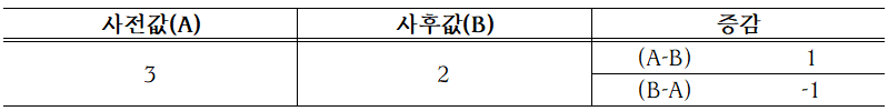우리는 증감을 두 가지 방식으로 표현할 수 있다. 사전(A)-사후(B)하여 “1이 감소했다”고 말할 수도 있고, 사후(B)-사전(A)하여 “증감이 –1이 되었다”고 말할 수도 있다. 바꿔말해 분석을 어떤 방식으로 하였는지에 따라 결과값은 다르게 나타날 수 있으나 의미는 동일하다. 그리고 그 결과를 해석해 문장으로 만들어내는 것은 연구자의 몫이 된다.