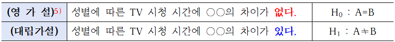 예를 들어 “성별(A)에 따른 TV 시청 시간(B)의 차이”이라는 연구 주제가 있다고 하자. 이때의 영가설과 대립가설은 다음과 같다.