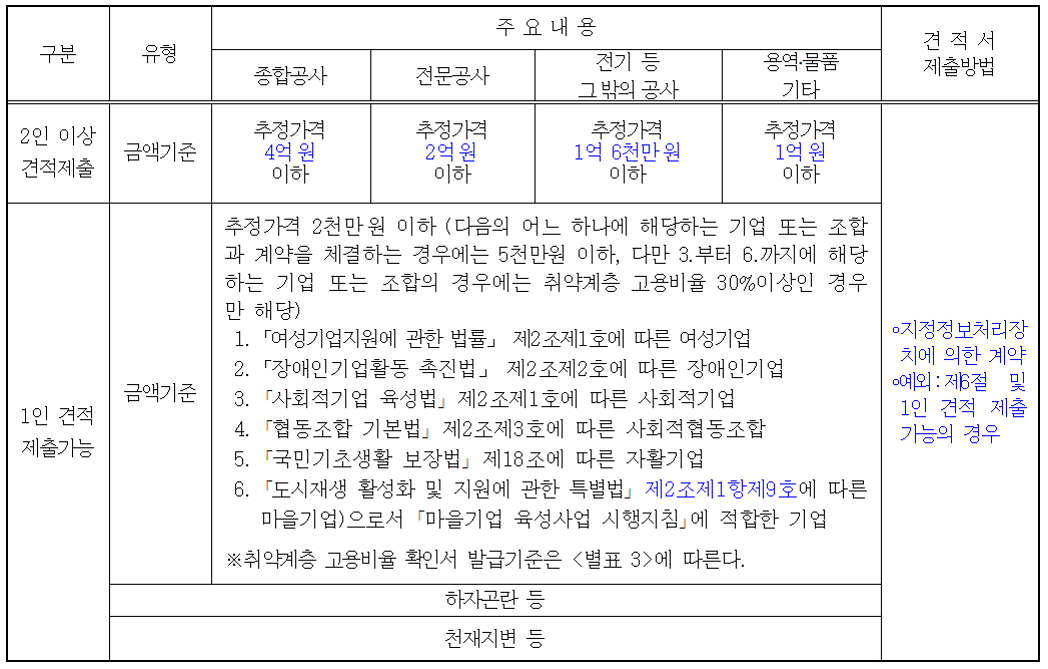 위 내용은 일반적인 경우이고, 여성기업, 장애인기업, 사회적기업, 사회적협동조합, 자활기업, 마을기업 등을 대상으로 할 때에는 금액기준이 다르니 별도로 확인이 필요하다.
