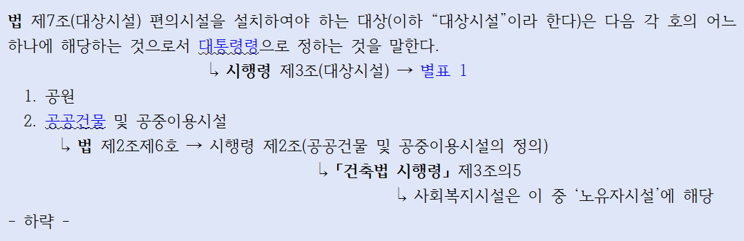 「장애인·노인·임산부 등의 편의증진 보장에 관한 법률」에 따른 편의시설의 설치 대상을 확인해보았다.