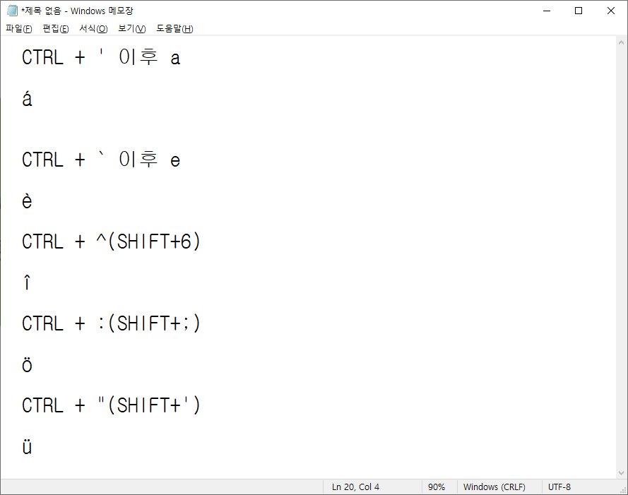 메모장에서 강조점 문자를 입력하기 위해서는 CTRL키와 넣고자 하는 강조점(`, ', ^)을 조합한 후 a, e, i, o, u 등 모음을 입력하면 한번에 만들어지는 것을 확인할 수 있다.