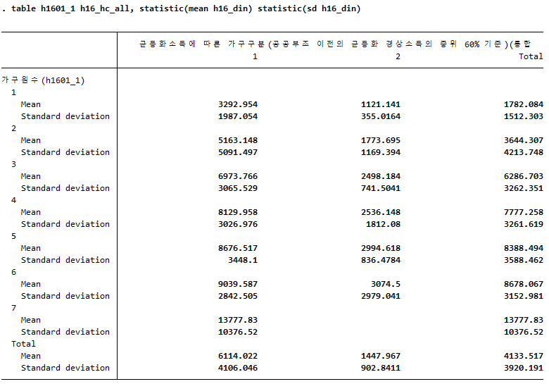 예) .table h1601_1 h16_hc_all, statistic(mean h16_din h16_cin) statistic(sd h16_din h16_cin)