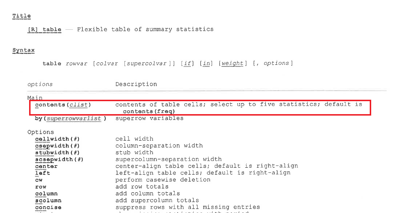 STATA 17 버전에서 table의 sysntax를 살펴보면,