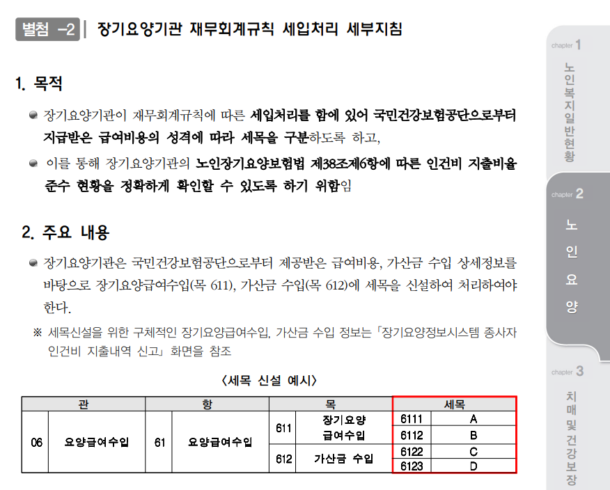 2021년 노인보건복지사업안내에 따르면, 장기요양기관의 재무회계규칙에 따른 세입처리에 관한 세부지침(p.429)을 내리고 있다.