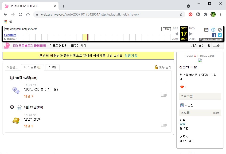 지금은 중단된 서비스이기에 더이상 보여주는 것은 없지만, 2007년 10월 13일에 박제된 과거의 단상이 여운을 남긴다.