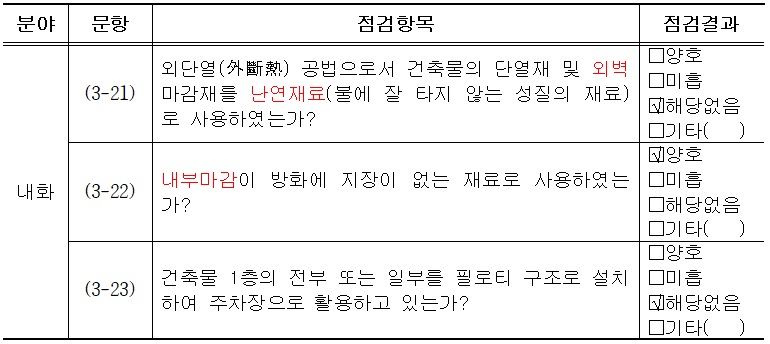 한편 내부 마감재료에 관해서는 「건축물의 피난ㆍ방화구조 등의 기준에 관한 규칙(약칭: 건축물방화구조규칙)」이 있다. 이 규칙은 1999년 제정되어 그해 5월 9일부터 시행된 바, 그 이후에 지어진 건물이라면 기본적으로 내화구조에 맞추어 지어졌다고 보는 것이 옳을 것이다.