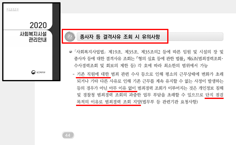 단지 2020년 사회복지시설 관리안내에서, 기존 종사자를 대상으로 이유없는 범죄경력조회는 지양하라는 내용이 있을 뿐이다.