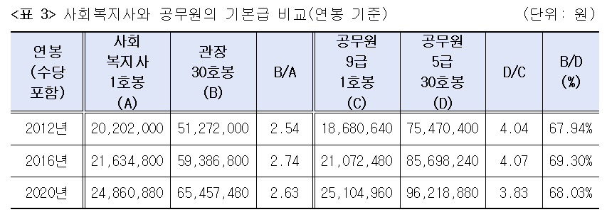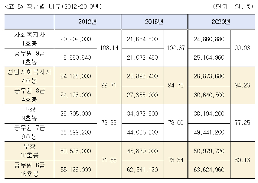 기본급의 비교는 사회복지사와 공무원의 초봉과 말호봉을 비교함으로써 그 배수차를 살펴보는 것이 처우의 수준을 판단하는 기준이 될 수 있다.