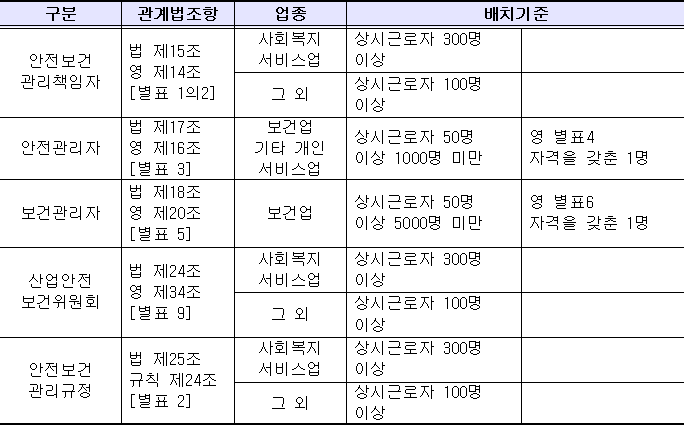 상시근로자에 따라 달라지는 관리책임자의 배치기준을 확인해야 함.