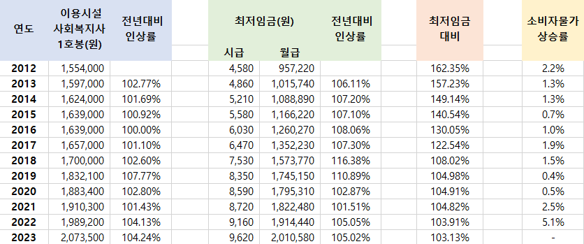 이용시설의 인건비 가이드라인이 제시된 2012년부터의 추이를 취합 정리해보았다.
