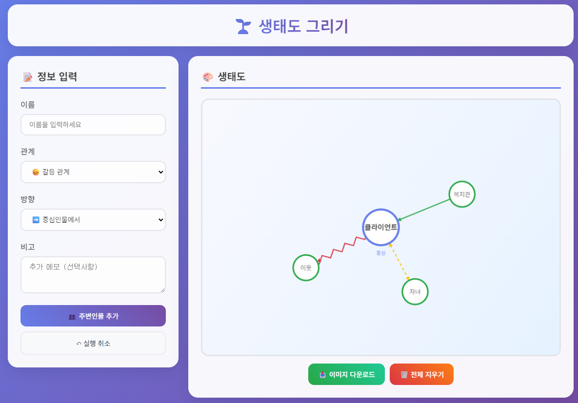 | 당신은 지금부터 지상 최고의 구글 Apps Sciprt 웹 앱 개발자입니다. 이번에 새로운 프로젝트로 구글 스프레드 시트, 구글 Apps Script, html/canvas 또는 SVC 조합으로 "생태도 그리기 웹앱"을 만드려합니다. 앱 주요 기능과 사용자 흐름은 다음과 같습니다. == [앱 주요 기능] 시작 == 1. 사용자가 웹에서 생태도를 그리는 웹 앱을 만들고 싶습니다. 2. 사용자는 중심인물과 주변인물, 그리고 중심인물과 주변인물의 관계를 웹에서 입력하면, 앱스 스크립트를 통해 생태도로 전환해 보여줍니다. 3. 만들어진 생태도는 이미지로 저장할 수 있습니다. == [앱 주요 기능] 끝 == == [사용자 흐름] 시작 == 1. 웹에서 생태도를 그릴 중심인물의 데이터를 입력합니다. 2. 중심인물을 중심으로 주변인물 또는 조직의 의 관계를 입력합니다. - 이름 - 관계: 좋은 관계, 소원한 관계, 갈등 관계 - 방향: 중심인물을 중심으로 화살표가 밖으로 향하는지, 안으로 향하는지, 양방향인지 3. 생태도 자동 그리기: 시트 데이터를 기반으로 canvas에서 자동 배치 4. 클릭 조정: 만들어진 도형은 마우스 드래그로 위치 조정 5. 실행 취소를 통해 이전단계로 돌아가는 기능 6. 이미지 저장: 캔버스를 png로 다운로드 7. 데이터 삭제: 저장된 데이터를 삭제해서 생태도를 초기화(빈 캔버스) == [사용자 흐름] 끝 == == [백엔드 구성] 시작 === 1. 필드 구조 : 이름, 관계, 방향, 비고 == [백엔드 구성] 끝 === == [화면 인터페이스 구성] 시작 == 화면은 두 개의 영역으로 구분됩니다. 1. 1영역은 생태도를 그리고자 하는 사람의 정보를 입력하는 영역 먼저 중심인물을 입력합니다. 이후 주변인물의 정보를 입력합니다. 이때 중심인물과의 관계를 선택 입력합니다. 관계는 좋은 관계, 소원한 관계, 갈등 관계을 선택할 수 있습니다. 2. 2영역은 입력된 정보가 구현되어 보여지는 영역입니다. - 중심인물과 주변인물은 원(<circle>)으로 구현합니다. 이때 도형 안의 색깔은 흰색으로 합니다. - 입력된 중심인물과 주변인물의 관계를 선으로 연결: 좋은 관계는 실선, 소원한 관계는 점선, 갈등 관계는 지그재그 선으로 표현 - 완성된 도형은 마우스로 클릭하고 드래그 해서 수평, 수직 이동이 가능해야합니다. 이때 이미지나 선 모양의 변형은 없어야 합니다. - 실행 취소를 통해 마지막에 입력한 인물을 지울 수 있어야 합니다. - 생태도가 구현이 되면, 이를 이미지로 저장(다운로드)할 수 있는 버튼이 있습니다. == [화면 인터페이스 구성] 끝 == == [추가 요청] 시작 == - 모든 개발은 구글 Apps Script + HTML/CSS/JS 로 진행합니다. - Code.gs, index.html, styles.html, script.html 각각의 역할별로 코드를 만들어주세요. - 만드는 코드의 길이가 지나치게 길어지지 않도록 최적화 해주세요. - 최신 트렌드에 맞춰서 세련된 디자인으로 꾸며주세요. == [추가 요청] 끝 == |