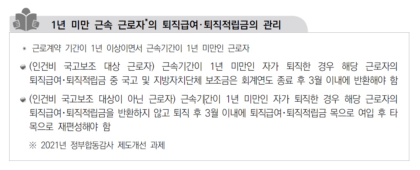 보건복지부 『2022년 사회복지시설 관리안내』 42페이지에는 새로운 내용이 하나 추가되었다. 바로 1년 미만 근속 근로자의 퇴직적립금을 어떻게 처리할 것인가에 대한 내용이다.