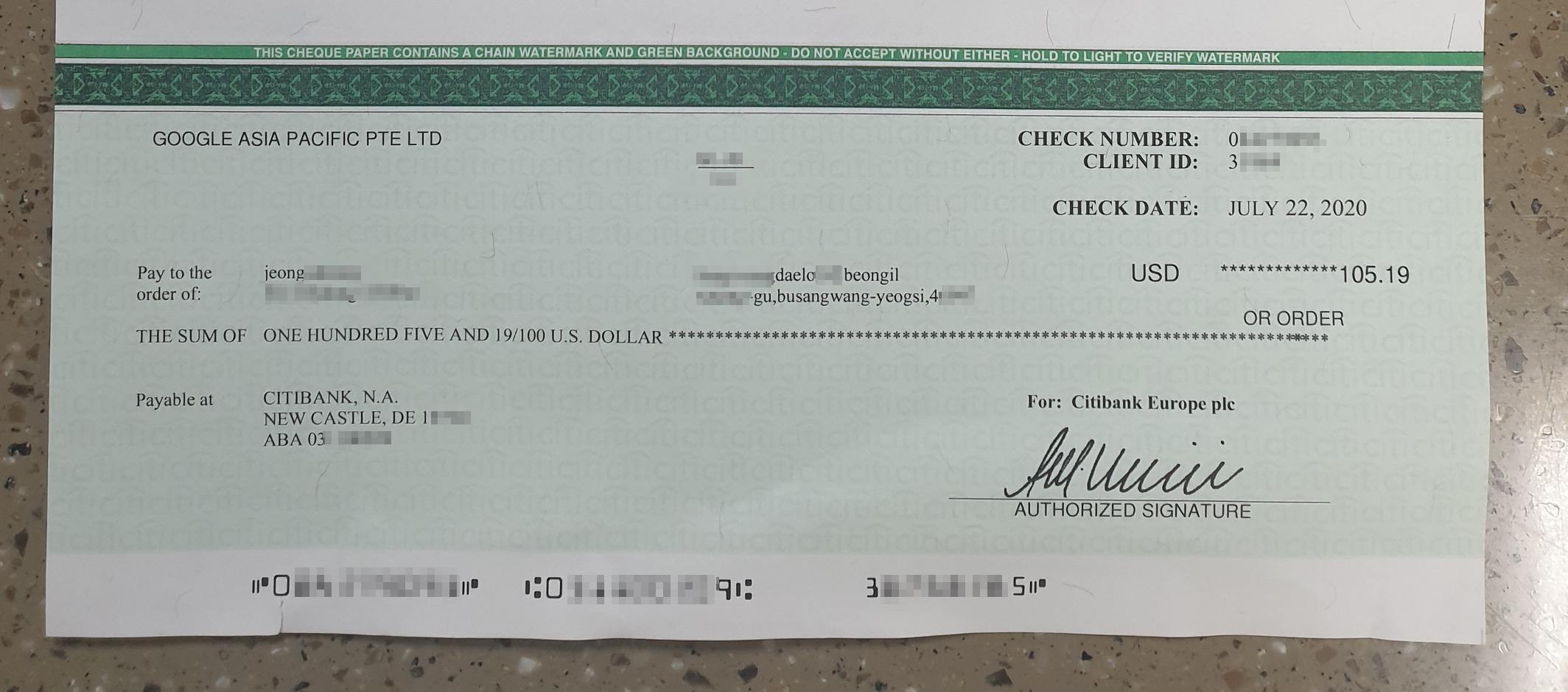 위 이미지가 구글에서 발급한 수표이다. $105.19로 이걸 환전하면 되는 것으로 알고 있다.
