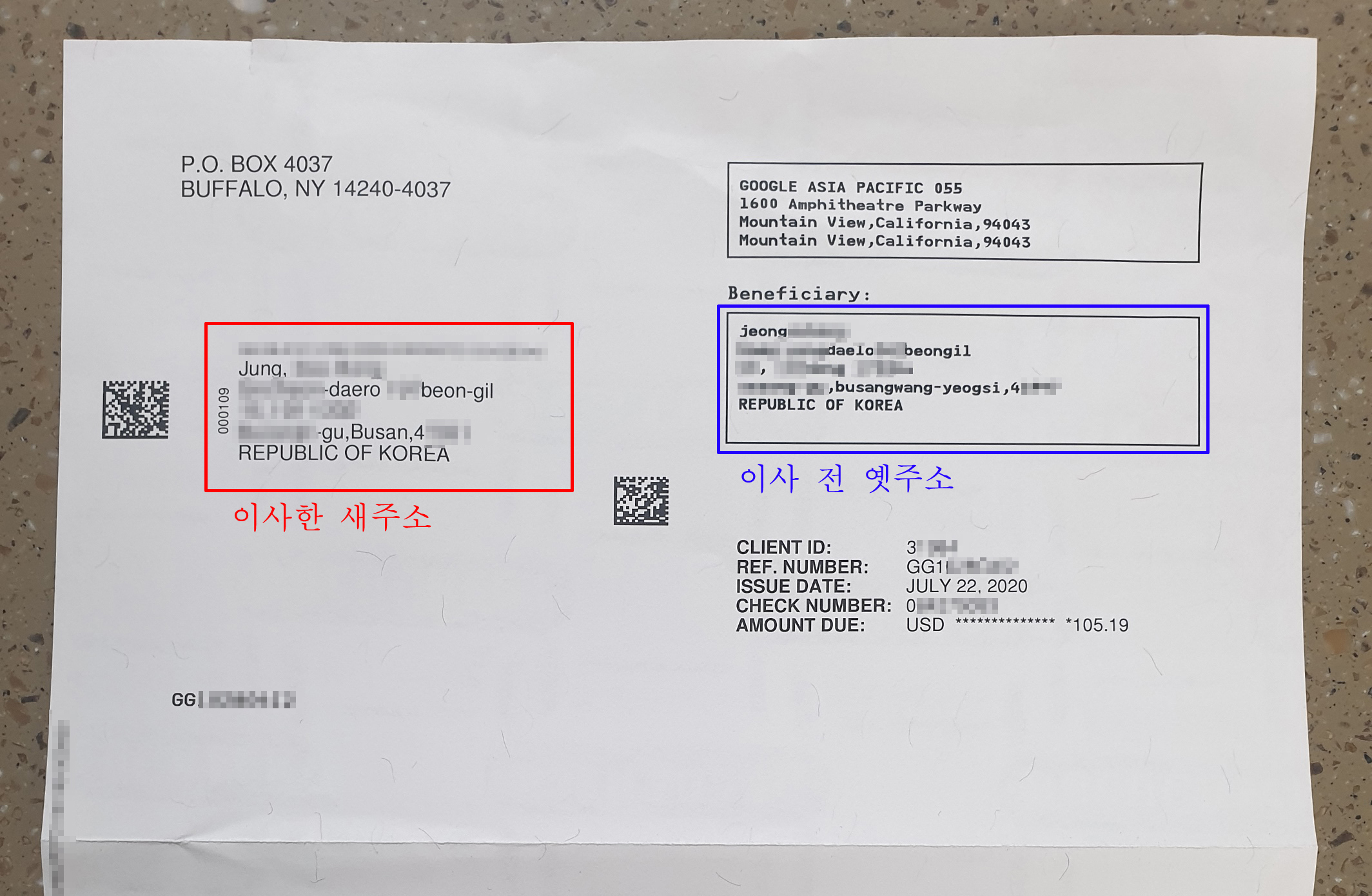 하지만 봉투를 열어보니 보여지는 새주소 외에 이사 전 옛주소로 나온다.