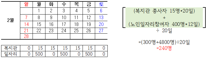 만일 사회복지관에 정규직 근로자 15명이 일을 하고 있고, 노인일자리사업 참여자 400명이 주 3회(월 12회) 근무를 하였다면, 아래 2월의 상시 근로자의 수는 다음과 같이 계산할 수 있다.