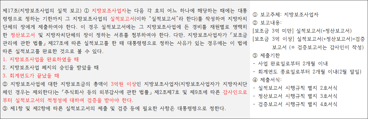 한편 법 제17조 제2항에 의거 지방보조금 총액이 3억원 이상이라면, 실적보고서에 대한 검증을 받아야 한다.