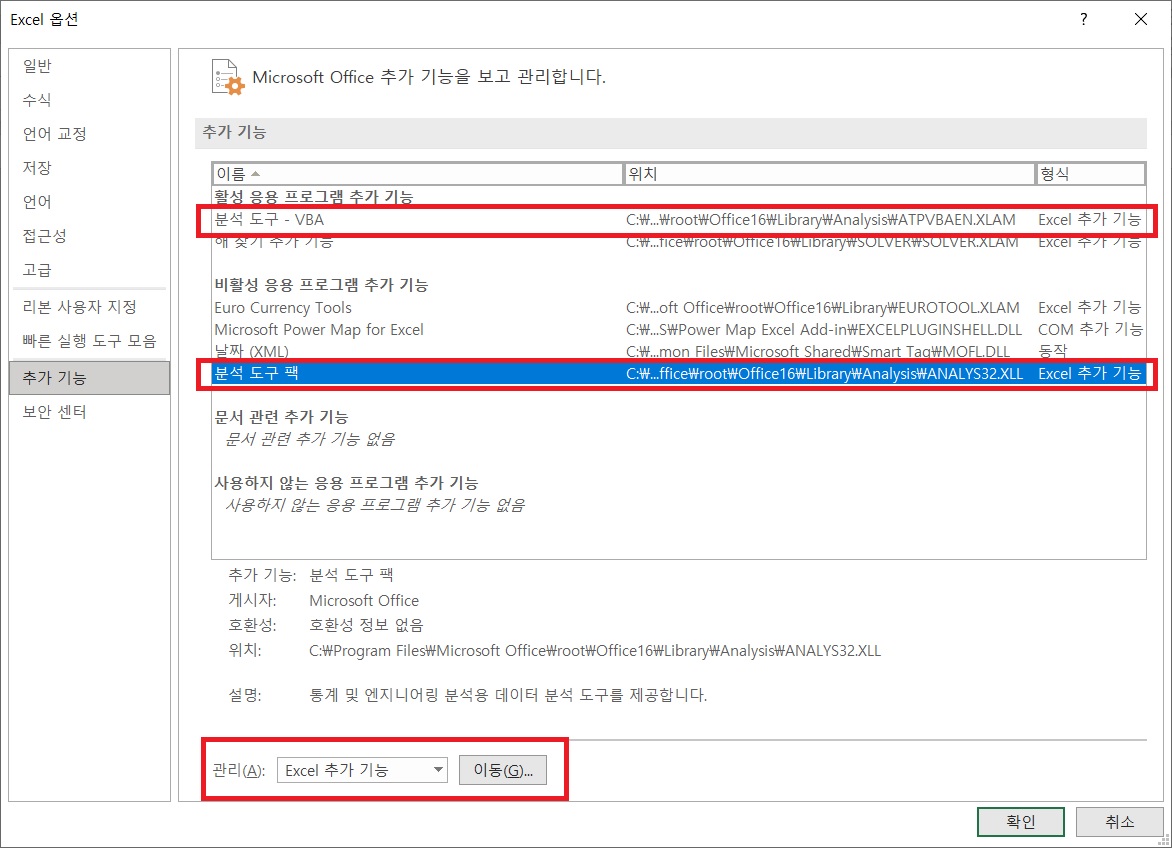 4. [ 파일 > 옵션> 추가 기능 ]을 클릭한 후, 하단의 관리(A) : Excel 추가 기능 [이동(G)]을 클릭한다.