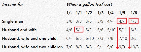 | When the gallon loaf of bread of a definite quality “shall cost 1 shilling, then every poor and industrious person shall have for his support 3 shillings weekly, either procured by his own or his family’s labour, or an allowance from the poor rates, and for the support of his wife and every other of his family, 1 shilling 6 pence; when the gallon loaf shall cost 1/6, then 4 shillings weekly, plus 1⁄10; on every pence which the bread price raises above 1 shilling he shall have 3 pence for himself and 1 pence for the others.” | "... 1갤런의 빵가격이 1실링 6펜스일 때, ... 보장받는 액수가 1펜스 오를 때마다 본인의 몫은 3펜스씩, 가족 몫은 한 명당 1펜스씩 올라간다." |