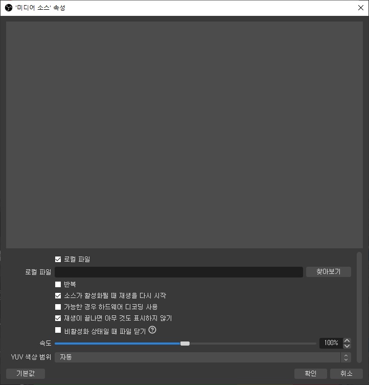 미디어 소스와 vlc 미디어 소스의 정확한 차이에 대한 자세한 설명은 없다. 다만 미디어 소스는 위 그림과 같은 옵션이 있고, vlc 미디어 소스는 표시 동작 설정이 있다는 점에서 다르다.