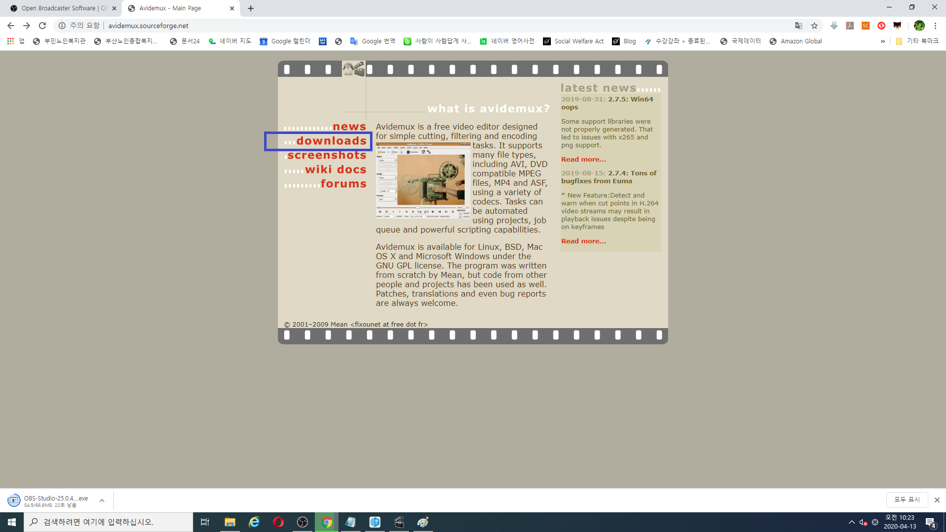 하나는 영상을 만들 수 있는 OBS studio이고, 다른 하나는 이렇게 만들어진 영상을 편집해주는 Avidemux라는 프로그램이 그것입니다.