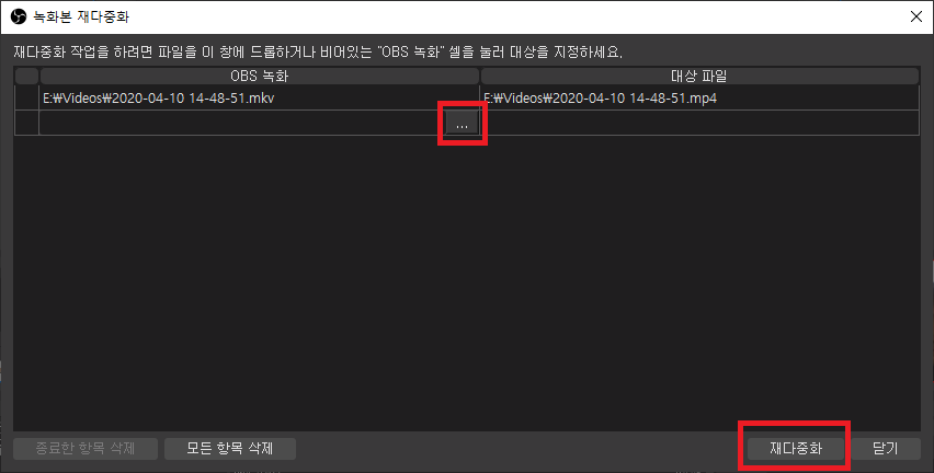 빨간 네모 안의 [...] 버튼을 클릭해 변화할 녹화파일을 선택하고, 원하는 출력형태를 결정한 다음 [재다중화]를 누르면 순식간에 새로운 파일로 변환해줍니다.