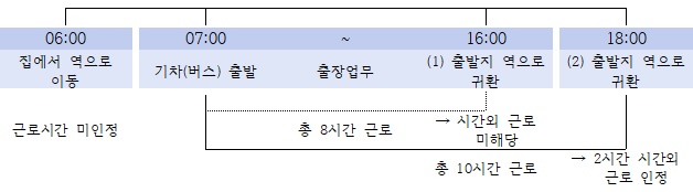 따라서 이 때 오후 4시에 근무지 기차역으로 도착해서 바로 퇴근하였다면 이는 총 8시간 근무로 보아 시간외 근무에는 해당하지 않는다. 하지만 시설로 복귀해 오후 6시까지 근무하고 퇴근하였다면 앞서 오전의 2시간에 대해 시간외 근무로 인정해야한다.