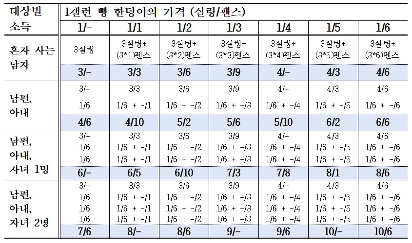 이상을 바탕으로 지급된 수당을 표(an example of the scales of relief)로 만들어 보았다.
