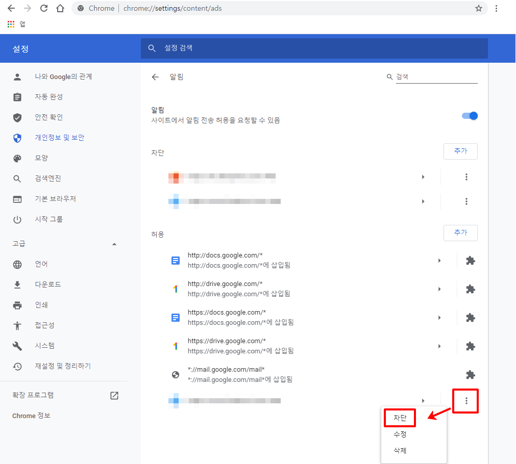 원치 않는 사이트만 "차단" 또는 "삭제"하면 팝업 알림 광고가 더이상 나타나지 않는다.
